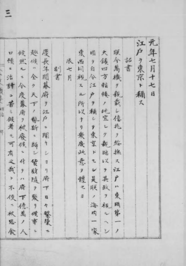 1868年(明治元年)日本天皇從京都遷移到江戶(也就是現(xiàn)在的東京)并發(fā)布詔書(江戸ヲ稱シテ東京ト為スノ詔書),將江戶稱為東京,在那個年代“京”和現(xiàn)代的“首都”一詞是同一個意思。根據(jù)這部詔書的內容,是把東京和京都并稱為首都。
