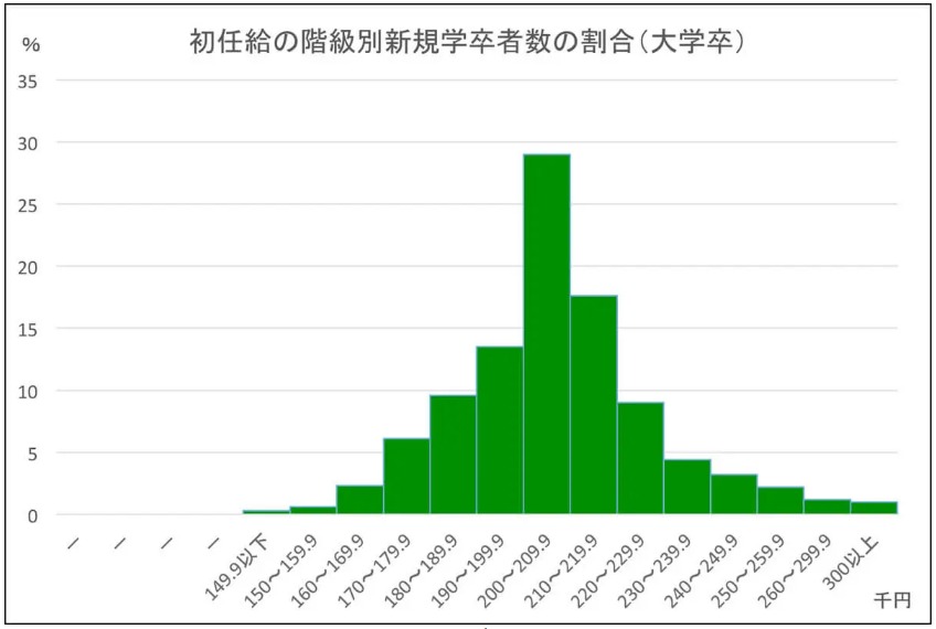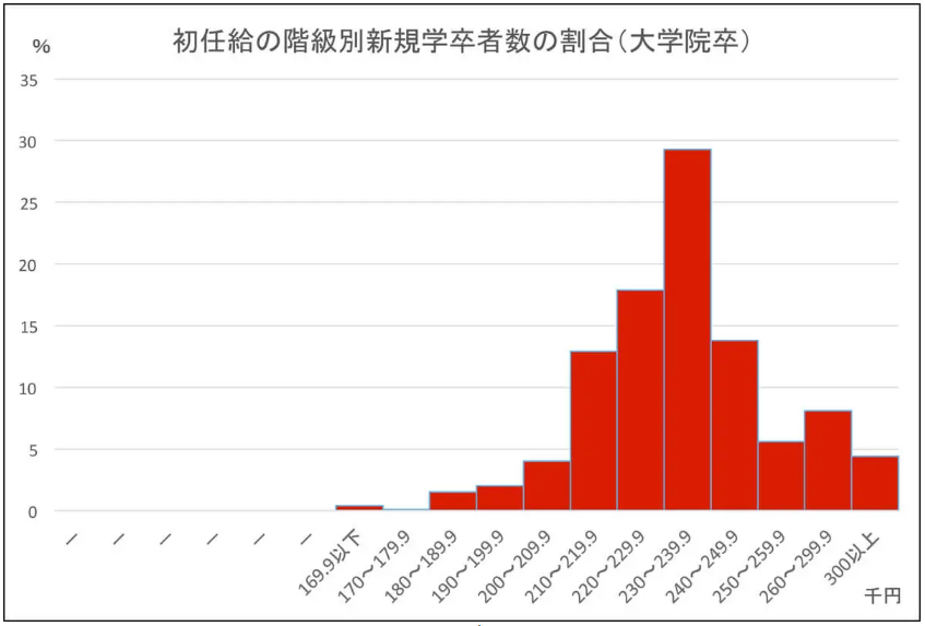 日本碩士(研究生)畢業(yè)生的起薪比大學(xué)畢業(yè)生略高,多集中在21萬日元至25萬日元左右,平均工資24萬日元(約合1.44萬人民幣),約有7成的碩士畢業(yè)生的起薪在這一水平區(qū)間。