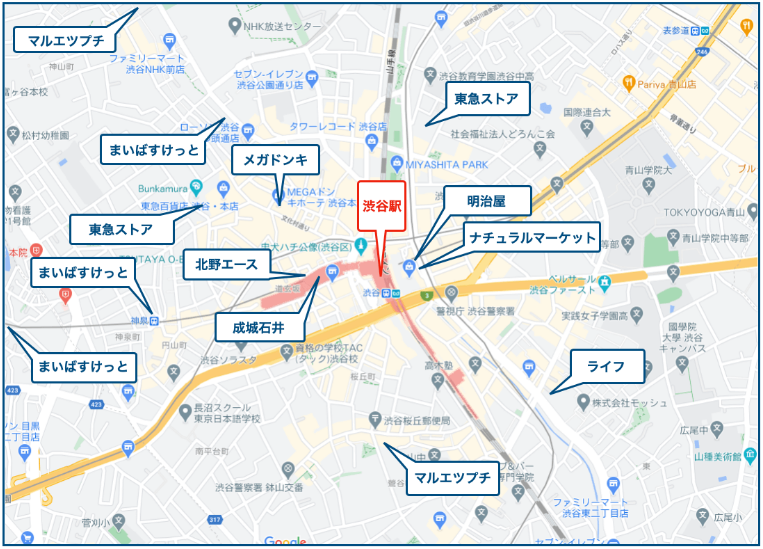 涉谷站周邊大大小小的商業設施簡直太多了,有很多生活配套的超市被淹沒在各大商鋪之中,于是容易造成“涉谷沒有超市”的假象。這么繁華的地方怎么能沒有超市呢?從高級超市到普通的生活超市,以及配有停車場的大型生活超市等數量眾多,生活十分便利。