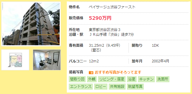 距涉谷站步行7分鐘,面積31.25平方米,2002年建的1DK公寓的二手房價格為5290萬日元。