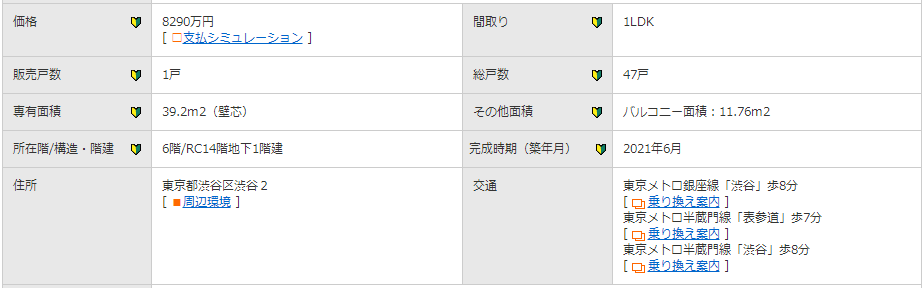 距涉谷站步行8分鐘,面積為39.2平方米,2021年6月竣工的1LDK新建公寓項目的售價為8290萬日元。