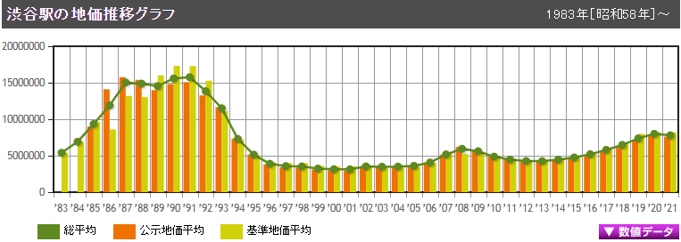 涉谷站是山手線等多條線路上重要的一個大站,2021年的公示地價、基準地價為每平方米779.5384萬日元。涉谷站周邊的地價近年來呈持續上漲趨勢,商業用地較多,因受到新冠肺炎疫情的影響略有下降。但隨著涉谷站再開發工程的完工,地價將有進一步上漲的空間。
