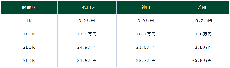 如上表所示,神田的房子除了1K的房租水平稍高一點(diǎn)以外,其他戶型的租金行情均較為便宜,1LDK便宜了近2萬日元,而2LDK~3LDK的房子更是便宜3萬日元以上。 因此,在千代田區(qū)內(nèi)的神田更適合有家庭的人居住。即使是一個人生活的情況下,1K的戶型也僅僅貴了“+0.7萬日元”而已,所以房租也不算過高。仔細(xì)合算后會發(fā)現(xiàn),租這樣的房子性價比很高。