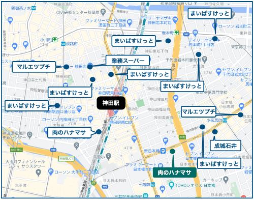 神田站周邊超市也很多,基本上不用為購買食品和食材而煩惱。另外,除了超市以外,這里還有許多藥妝店、藥店和菜站。以下是神田周邊超市位置的地圖,綠色超市是24小時營業(yè)的店鋪。
