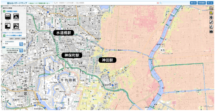 從上面的浸水地圖可以看到,神田周邊的部分地區(qū)有可能在“0.5m~3m”浸水的風(fēng)險區(qū)域。如果想住在這里,又想盡量減少水災(zāi)的風(fēng)險,可以考慮一下附近風(fēng)險較低的“神保町站”和“水道橋站”等地方,或者在神田附近盡可能租住2層以上的房子比較安全。