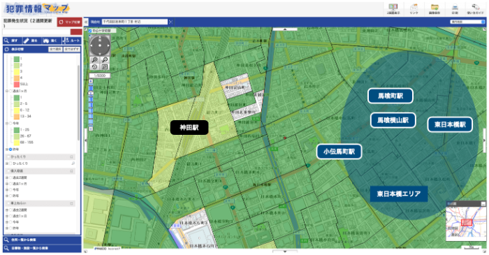 神田站周邊有眾多居酒屋,經(jīng)營到夜晚的店鋪較多,所以醉漢也多,治安也相對不好。 以下地圖為警視廳發(fā)布的“犯罪信息地圖”,車站周邊按黃綠色區(qū)分。