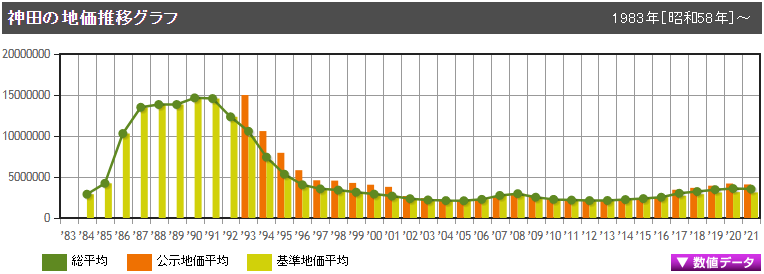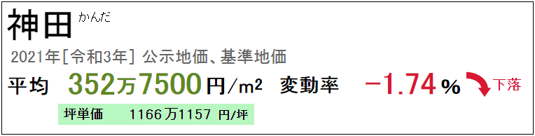 神田2021年3月公示的基準(zhǔn)地價為每平方米352.75萬日元,近年來地價穩(wěn)中有升,因受疫情的影響才略有下降。