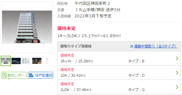 神田附近的新建公寓項目房源較少,目前距車站步行3分鐘,面積為25.17㎡-61.89㎡的1R-3LDK戶型,暫定2022年3月入住的公寓項目尚無定價。