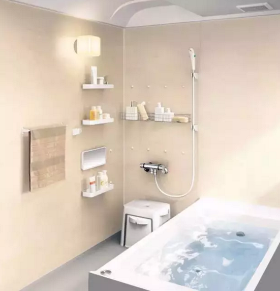 日本人喜歡泡澡,浴缸是浴室里非常重要的設施。日本的浴缸一般比較深,但由此每年都會發生老人因泡澡而溺亡的事故。所以,考慮到泡澡的安全性,現在新的整體浴缸里被設計成了階梯式的結構,可以便于老人和孩子進出浴缸,并增加了坐著的功能,有效提升了老人和小孩泡澡時的安全系數,同時泡澡時還可以改變高度,又安全又舒適。