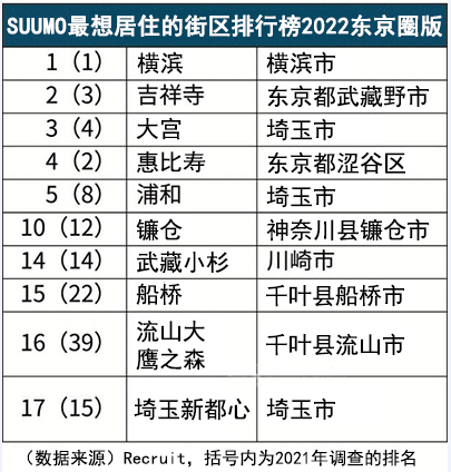 2022版東京圈最想居住的街區排行榜中,毫無懸念的橫濱排名第一名,此前高人氣的吉祥寺位列第二名,口碑一直不錯的大宮排名第三位。