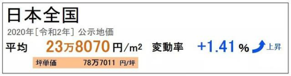 根據日本全國公示的地價,2020年日本全國公示地價為平均23萬8070日元/㎡,上漲了1.41%。東京于2020年的土地價格相較于2019年有4.24%的漲幅,同時東京的地價已連續5年呈上漲趨勢。