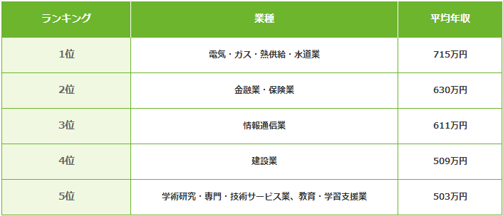 日本收入最高的行業目前排名第一的為能源類相關企業,電氣、燃氣、熱力、水道等公司,包括燃氣能源供應公司及電力工程公司等。企業規模越大、員工人數越多的公司,正社員的收入越高。住宿業和餐飲業等服務性行業雖然從業人員較多,不過由于兼職工作的人數也較多,平均收入相應不高。