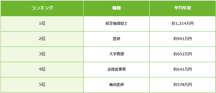 根據職業劃分,收入較高的排名前五名的職業依次為飛行員、醫生、大學教授、律師、牙醫。