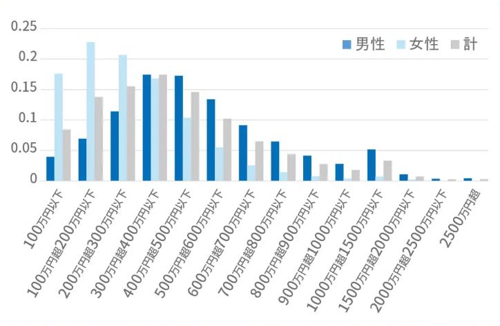 從性別分析,日本男性年收入平均值為532萬日元、女性為292萬日元。其中大多數男性的年收入在300-400萬日元之間、大多數女性的年收入在100-200萬日元之間。男性中55-59歲年齡段收入最高,為668萬日元;女性中45-49歲年齡段收入最高,為458萬日元。雖然男性收入普遍高于女性,但無論男女,學歷越高則收入平均值越高。