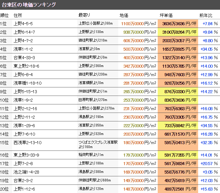 東京都臺東區最高價格地點是“臺東區上野4-5-5”(1100萬日元/㎡),最低價格地點是“臺東區清川2-2-6”(41萬日元/㎡)。