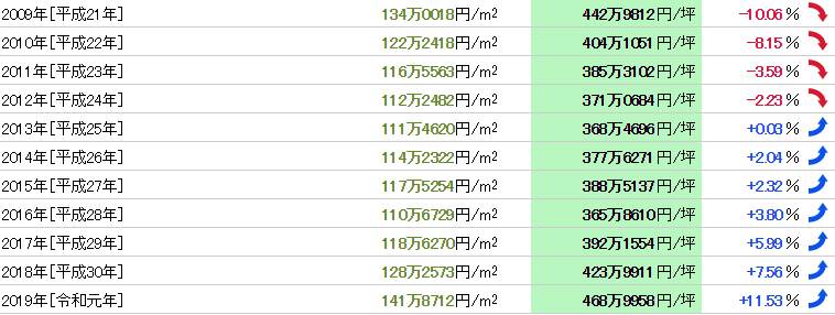 從1983年(昭和58年)開始37年的數據,公示地價的最高值是543萬7692日元/㎡(1990年),最低價格是108萬1542日元/㎡(2005年),兩者的差異是5.03倍。基準地價的最高值是796萬日元/㎡(1989年),最低價格是99萬4777日元/㎡(2005年),兩者的差異是8.00倍。