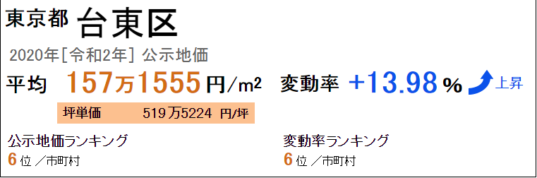 東京都臺東區最新公示地價平米單價平均為157萬1555日元/㎡(2020年“令和2年”),坪單價平均為519萬5224日元/坪,全國排名第6。從上一年開始的變動率是+13.98%,變動率的全國排名是第6位。
