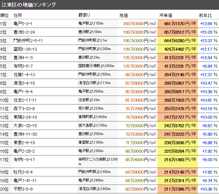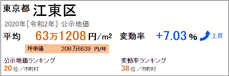 東京都江東區(qū)最新基準(zhǔn)地價(jià)平米單價(jià)平均為62萬(wàn)1148日元/㎡(2019年“令和元年”),坪?jiǎn)蝺r(jià)平均為205萬(wàn)3382日元/坪,全國(guó)排名第19位。從上一年開始的變動(dòng)率是+7.28%,變動(dòng)率的全國(guó)排名是32位。