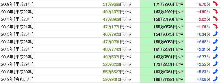 從1983年(昭和58年)開始37年的數(shù)據(jù),公示地價(jià)的最高值是211萬(wàn)7272日元/㎡(1990年),最低價(jià)格是42萬(wàn)8038日元/㎡(2005年),兩者的差異是4.95倍。基準(zhǔn)地價(jià)的最高值是312萬(wàn)3571日元/㎡(1988年),最小價(jià)格是42萬(wàn)1583日元/㎡(2004年),兩者的差異是7.41倍。