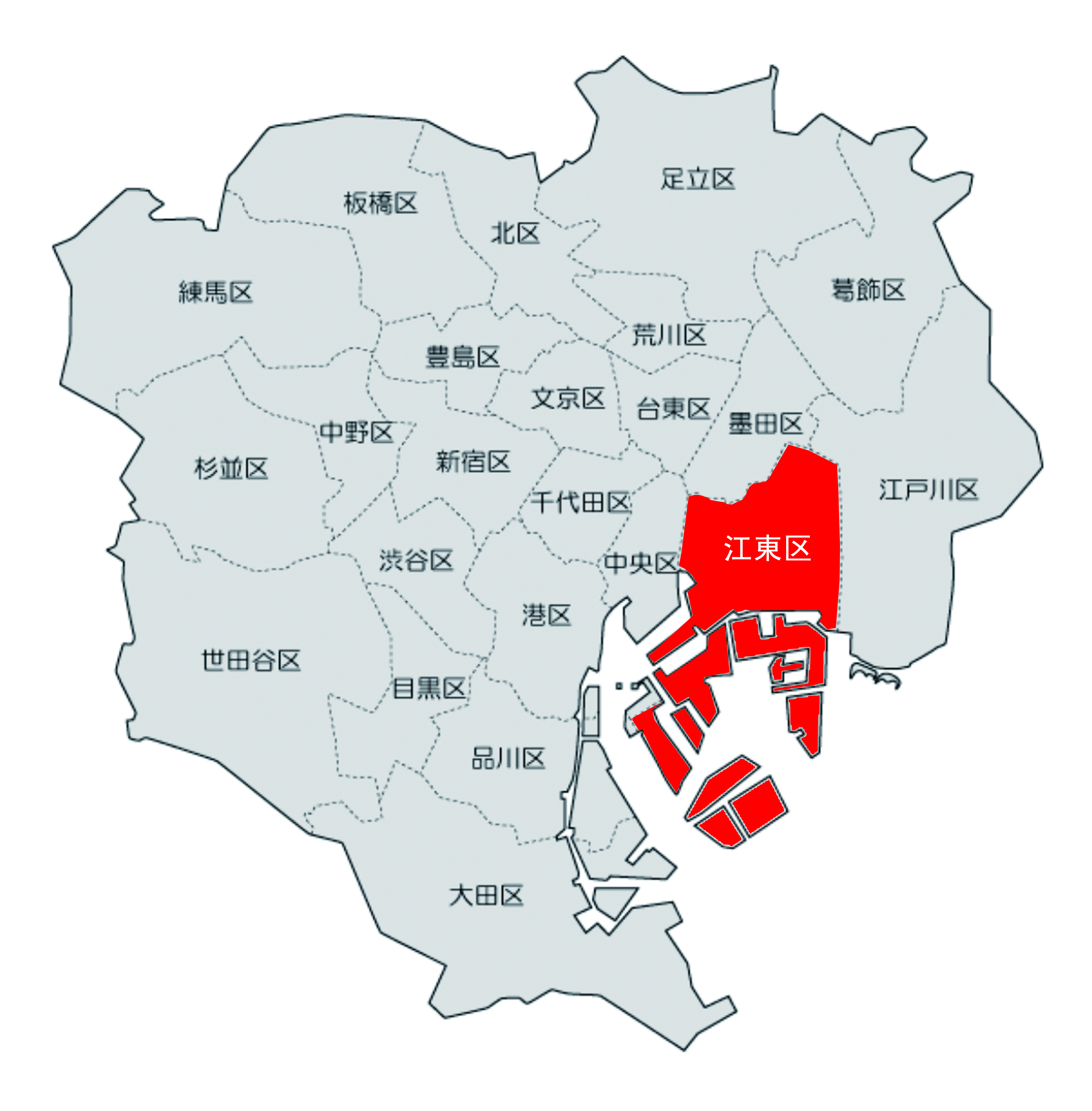 江東區(qū)位于東京23區(qū)的東部。江東區(qū)是東京的特別區(qū)之一,是一個(gè)新興的發(fā)展區(qū)。南臨東京灣,由于區(qū)內(nèi)運(yùn)河與橋梁眾多,亦被稱作為“水彩都市”。它由一系列道路和水道組成,船經(jīng)常在住宅區(qū)附近出入。在江東區(qū)內(nèi)有從東京大都會(huì)地區(qū)和錦系町、龜戶二級(jí)市中心劃分出來(lái)的沿海分中心,其中包括兩個(gè)分市中心。所以,江東區(qū)聚集了許多游客和上班族。