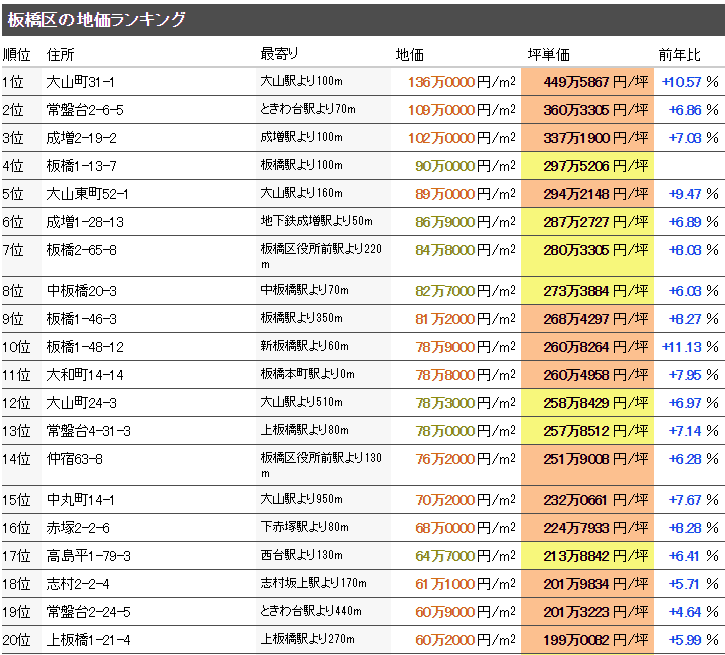 東京都板橋區(qū)最新基準(zhǔn)地價(jià)平米單價(jià)平均為54萬3093日元/㎡(2019年“令和元年”),坪?jiǎn)蝺r(jià)平均為179萬5351日元/坪,全國排名第23位。從去年開始的變動(dòng)率是+5.70%,變動(dòng)率的全國排名是44位。