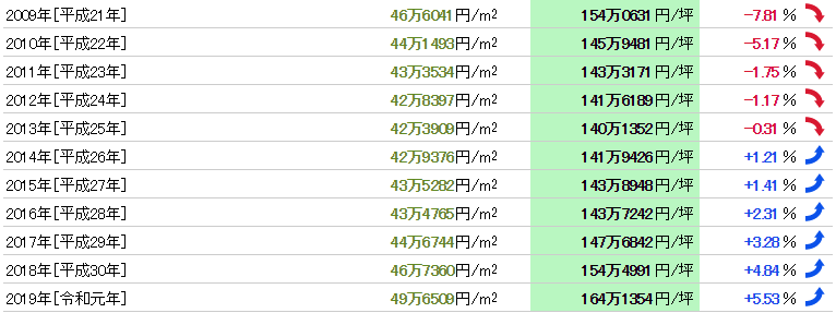 從1983年(昭和58年)開始37年的數(shù)據(jù),公示地價(jià)的最高值是160萬6411日元/㎡(1989年),最低值是40萬6673日元/㎡(2005年),兩者的落差是3.95倍。基準(zhǔn)地價(jià)的最高值是122萬4882日元/㎡(1990年),最低值是30萬7000日元/㎡(1983年),兩者的落差是3.99倍。