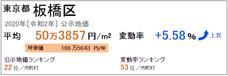 東京都板橋區(qū)最新公示地價(jià)平米單價(jià)平均為50萬3857日元/㎡(2020年“令和2年”),坪?jiǎn)蝺r(jià)平均為166萬5643日元/坪,全國排名第22位。從去年開始的變動(dòng)率是+5.58%,變動(dòng)率的全國排名是53位。