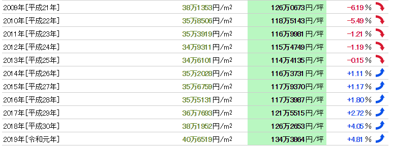 從1983年(昭和58年)開始37年的數(shù)據(jù),公示地價的最高值是135萬6434日元/㎡(1992年),最低值是31萬4727日元/㎡(1984年),兩者的落差是4.31倍。基準地價的最高值是131萬0111日元/㎡(1988年),最小價格是23萬7857日元/㎡(1983年),兩者的落差是5.51倍。