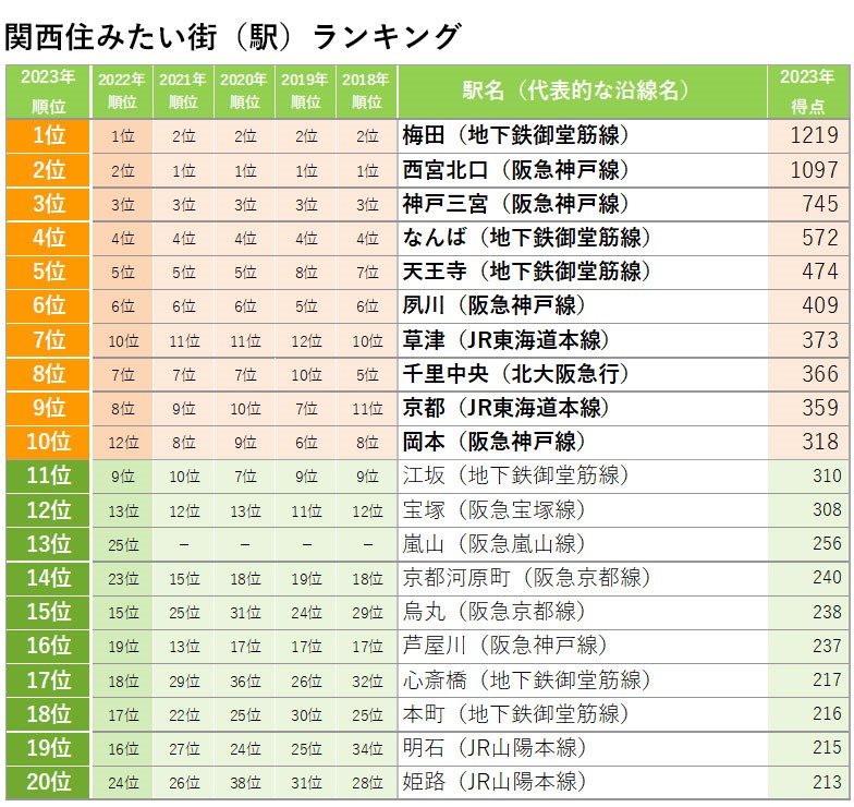 例如神戶三宮(+49分,從第3位升至第3位)、十三(+37分,從第123位升至第68位)、中津(+36分,從第48位升至第32位)等,顯示出都市中心受關注度的高度。