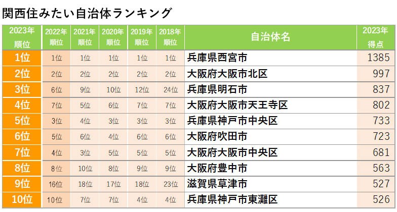 2023年的“理想居住城市排名”中,“梅田”收獲了絕對的人氣。此外,“神戶三宮”、“十三”、“中津”、“難波”等城市也獲得了高分,表明城市中心區的受歡迎程度明顯上升。
