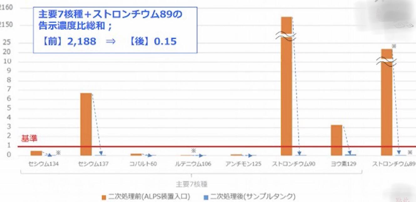 “高級液體處理系統(tǒng)(Advanced Liquid Processing System,ALPS)”簡單來說,就是利用特殊材料通過“吸附”、“共沉淀預(yù)處理”等工藝,能夠?qū)㈡J、銫等60余種放射性物質(zhì)濃度降至一定的標(biāo)準(zhǔn)值以內(nèi)(但其中的放射性物質(zhì)氚基本除不掉),然后存儲于專門的儲水罐內(nèi)。如圖所示,經(jīng)過ALPS設(shè)備處理以后的核廢水中的各項(xiàng)數(shù)值均大幅下降至標(biāo)準(zhǔn)范圍內(nèi)。