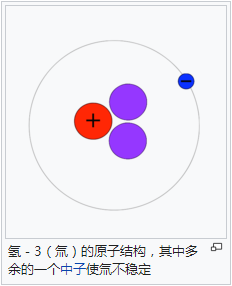 根據(jù)維基百科:氚(Tritium;符號:T或3H,注音:ㄔㄨㄢ;拼音:chuān)。亦稱超重氫,是氫的同位素之一,元素符號為T或3H。它的原子核由一顆質(zhì)子和兩顆中子所組成,并帶有放射性,會(huì)發(fā)生β衰變,放出電子變成氦-3,其半衰期為12.43年。其名稱Tritium源至希臘語:τρ?τος,羅馬化:trítos,意思為“第三”)由于氚的β衰變只會(huì)放出高速移動(dòng)的電子,不會(huì)穿透人體,因此只有大量吸入氚才會(huì)對人體有害。