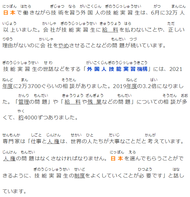 日本で働きながら技術(shù)を習(xí)う外國人の技能実習(xí)生は、6月に32萬人以上いました。會(huì)社が技能実習(xí)生に給料を払わないことや、正しい理由がないのに會(huì)社をやめさせることなどの問題が続いています。