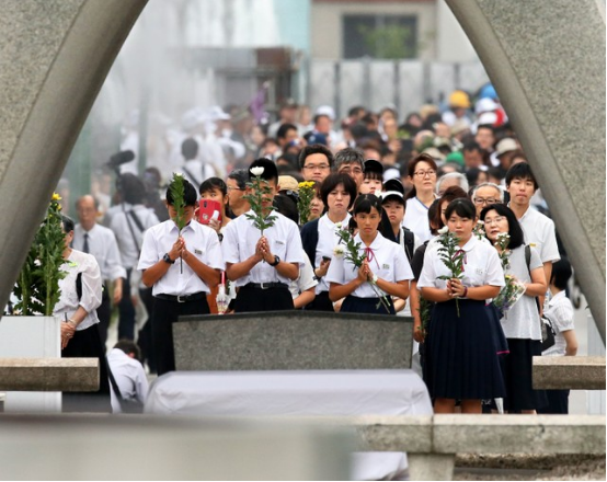 8月6日是廣島遭受原子彈轟炸74周年的“原爆之日”。當(dāng)天,在廣島市中區(qū)的和平紀(jì)念公園,約有5萬人在雨中參加了和平紀(jì)念儀式。其中包括原子彈爆炸受害者、遺屬及92個國家的駐日大使等人。參加者在原子彈被投下的上午8點15分,集體向遇難者進(jìn)行了默哀。